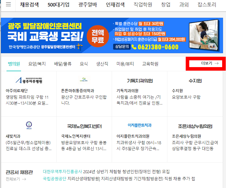 병원 및 요양복지, 생산직, 배달물류, 미용뷰티, 교육학원등 관련계통을 찾으신다면 메인화면에서 더보기 버튼을 눌러주세요.