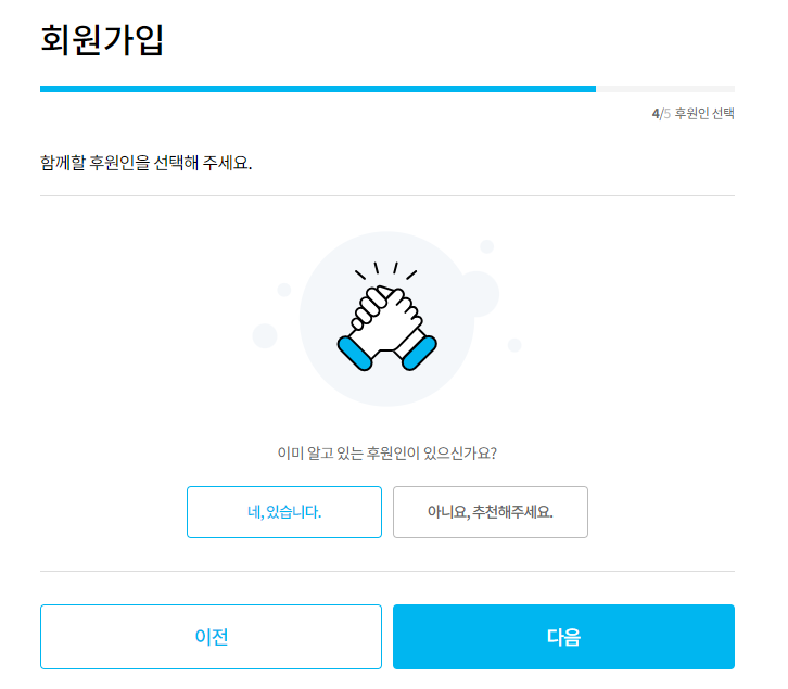 본인인증을 하시면 후원인을 선택하라고 나오는데요. 여기에서는 지인 또는 가족코드가 있으면 진행해 주시고