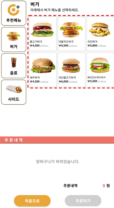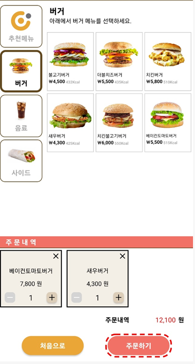 주문완료가 장바구니 추가 누르셔야 결제든 추가메뉴 가능합니다. 저는 새우버거를 추가해 보겠습니다.
