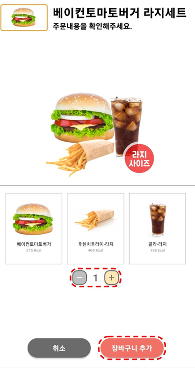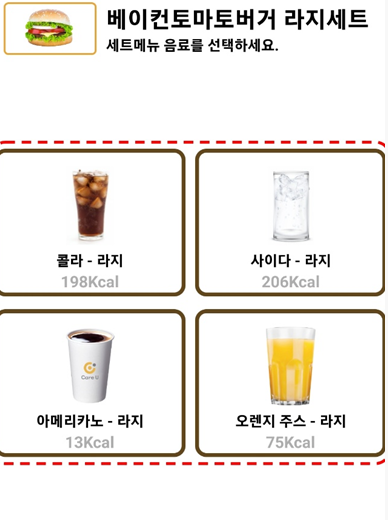 여기서 또 중요한 세트버거와 햄버거만 주문할 건지도 중요합니다. 세트버거 주문 시 음료도 골라야 하며 사이드 메뉴도 선택해야 하는 점 유의하세요!