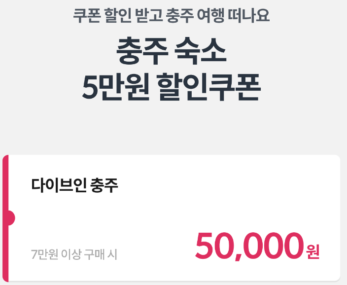 충주 다이브 페스티벌에 맞추어 충주시에서 준비한 숙박할인프로모션이 진행중입니다. 충주여행을 가시는 분들은 꼭 숙박할인 5만원권 받으셔서 즐거운 여행 되시기 바랍니다.